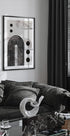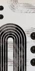 Ein auffälliges abstraktes Poster mit kräftigen schwarzen Bögen, kreisförmigen Formen und geschichteten geometrischen Linien auf einem leicht strukturierten Hintergrund. Die monochrome Palette betont Symmetrie und Ausgewogenheit und macht sie zu einem eleganten Statement in modernen, japanisch oder skandinavisch inspirierten Innenräumen.