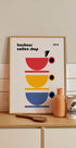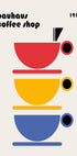 Ein vom Bauhaus inspiriertes Café-Poster aus dem Jahr 1919 mit drei gestapelten Tassen in Rot, Gelb und Blau in kräftigen geometrischen Formen. Minimalistisch und dennoch lebendig drückt dieses Design den künstlerischen Geist der Moderne und der Café-Kultur aus. Perfekte Wandkunst für Küchen, Cafés und Liebhaber des Bauhaus-Stils.