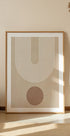 Ein stilvolles, minimalistisches Poster mit klaren weißen Bögen kombiniert mit einem einfarbigen braunen Kreis auf sanften Beigetönen. Die geometrische Komposition spiegelt das moderne Design der Mitte des Jahrhunderts wider und verleiht jedem Interieur Wärme, Schlichtheit und Eleganz.