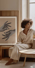 Eine stilisierte Hand streckt sich in einer eleganten Collage aus Formen und Silhouetten dem Licht entgegen. Warme Beige- und Brauntöne treffen auf tiefschwarze Kontraste in einem von der Mitte des Jahrhunderts inspirierten, minimalistischen Ausdruck. Grafische Ebenen und negative Räume schaffen Ruhe, Ausgeglichenheit und Bewegung – ein Schwerpunkt von Pictufy Studio III. Verleiht dem Raum eine ruhige, moderne Note.