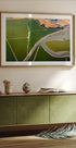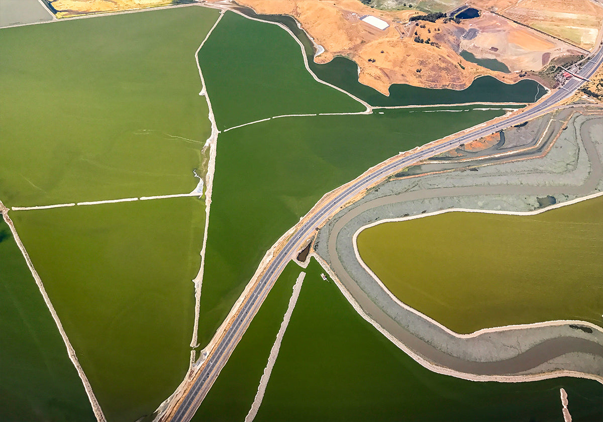 Eine atemberaubende Luftaufnahme der Landschaft der San Francisco Bay, wo kurvenreiche Straßen, Bäche und grüne Felder ausgeprägte geometrische Muster bilden. Dieses von oben eingefangene Kunstwerk unterstreicht die Schönheit der Grenzen der Natur und des Menschen und macht es zu einer modernen fotografischen Wandkunst.
