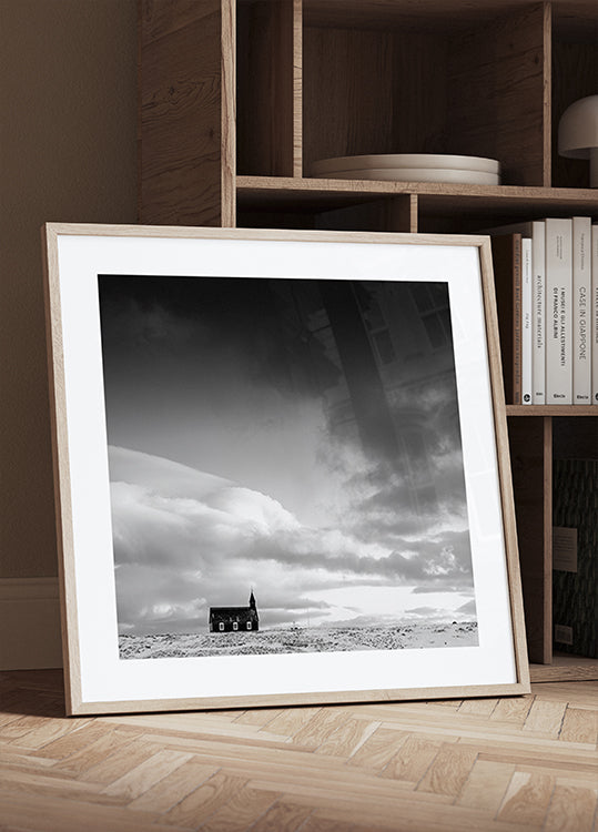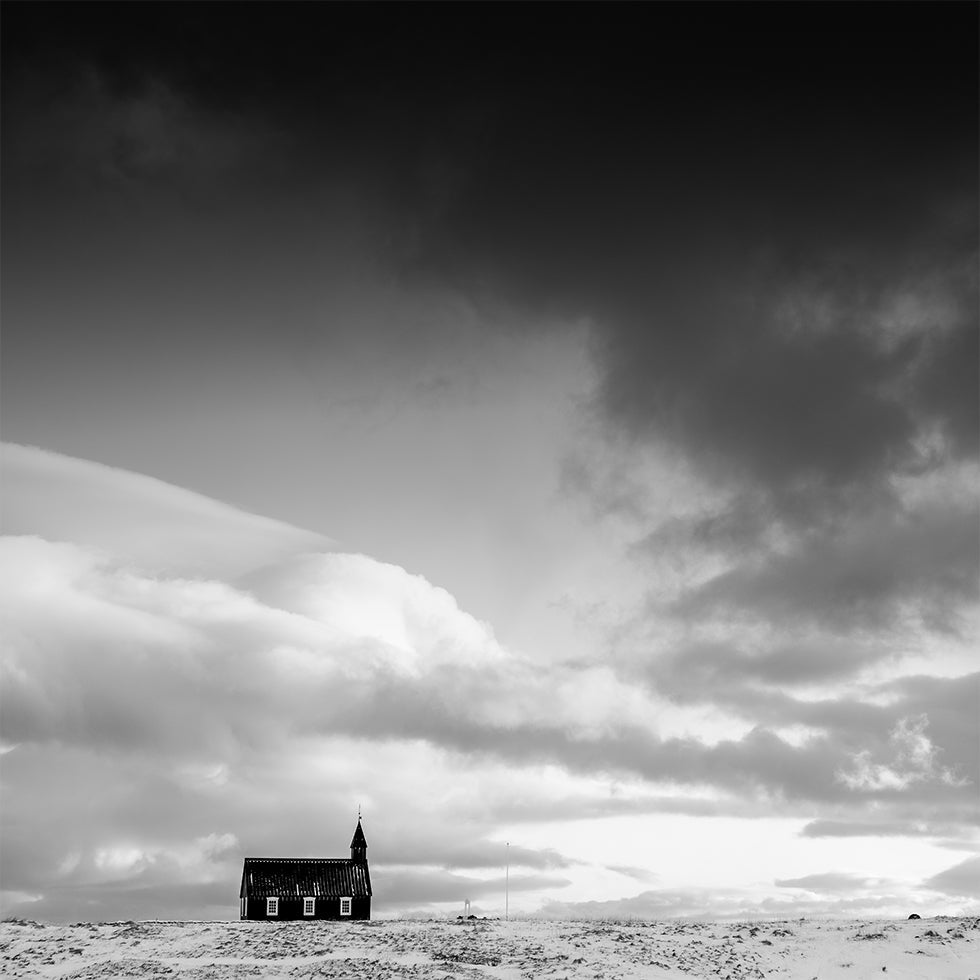 Robert Bolton indfanger Búðakirkja på Snæfellsnes i et højlyst, monokrom vinterlandskab. Den sorte kirke står alene mod sne og himmel, hvor minimalismen forstærker følelsen af ro, tro og modstandskraft. Et poetisk billede af nordisk stilhed, kontrast og håb midt i vildmarken. En hyldest til islandske vidder, stilren tro og stille styrke.
