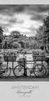 En stemningsfuld hyldest til Amsterdam: Melanie Violas værk fanger Herengracht i elegant sort-hvid. Klassiske kanalhuse spejler sig i vandet, cykler hviler mod broens gelænder, og en rolig båd glider forbi under tunge skyer. Et tidløst bybillede, der bringer storbyens poesi ind i hjemmet. Perfekt til dig, der elsker klassisk, urban æstetik.