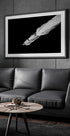 Eine elegante Yacht schneidet in starkem Kontrast durch das dunkle Wasser, von oben in raffiniertem Monochrom eingefangen. Dieses minimalistische Motiv zelebriert Freiheit, Präzision und die Ästhetik der Bewegung – ideal für moderne Innenräume mit Sinn für Stil und Ruhe.