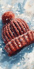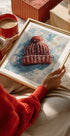 Eine eindrucksvolle Winterillustration einer Strickmütze mit Quaste im stillen Schneefall – ein kleiner Moment der Gemütlichkeit, der Ruhe und Verspieltheit der Kindheit. Die weichen Formen und das schlichte Motiv lassen der Fantasie freien Lauf, während der Schnee die Welt um sich herum dämpft. Ein poetischer Winterlook von Ohkimiko. Perfekt, um warme Wintererinnerungen ins Zuhause zu bringen.