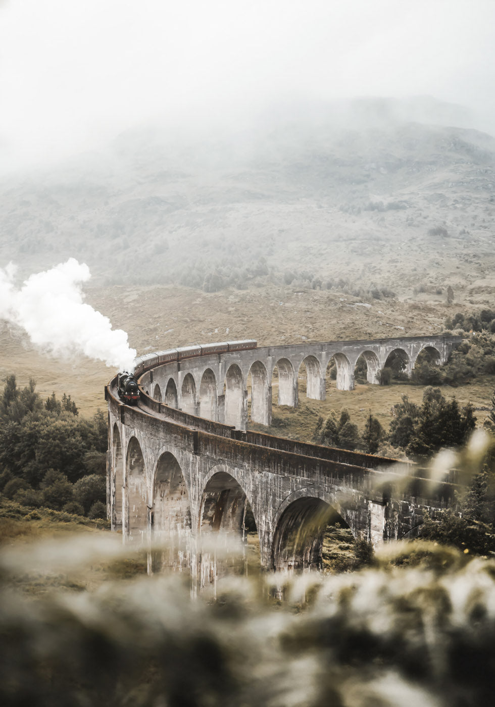 Ein atemberaubendes Foto eines Dampfzuges, der umgeben von nebligen Hochlandlandschaften ein historisches Viadukt überquert. Die geschwungene Steinbrücke vermittelt ein Gefühl von Abenteuer und Nostalgie. Ein ideales Poster für Reiseliebhaber und Eisenbahnfans.