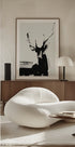 Ein abstraktes Schwarz-Weiß-Porträt eines Hirsches, erstellt mit kräftigen, ausdrucksstarken Pinselstrichen. Gesicht und Geweih sind in den rohen, kunstvollen Strichen zu erkennen, die dem Motiv einen dramatischen und modernen Ausdruck verleihen.