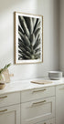 Eine intensive Nahaufnahme einer Ananas fängt die skulpturalen Formen der Blattkrone und das grafische Muster der Schale in tiefen Grün- und Goldtönen ein. Der enge Ausschnitt und die sanfte Studiobeleuchtung erzeugen einen ruhigen, modernen Ausdruck mit frischer tropischer Energie und sinnlicher Textur, die den Raum erhebt. Perfekt als ruhiger Mittelpunkt in der Küche oder im Wohnzimmer.