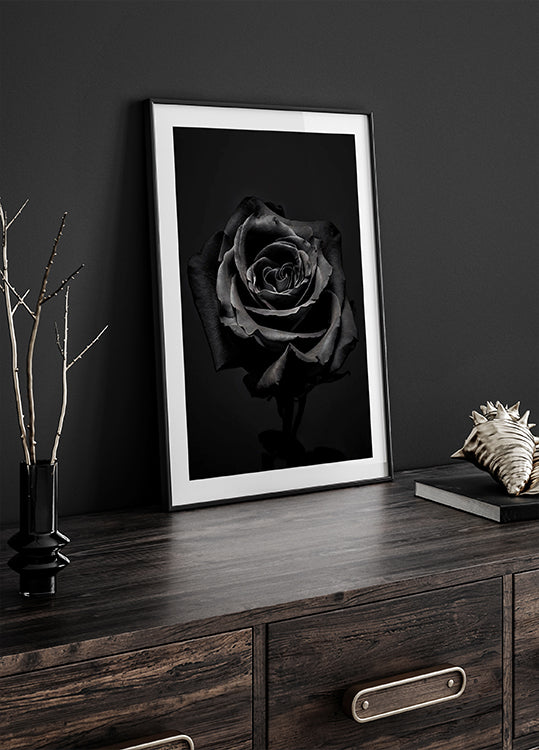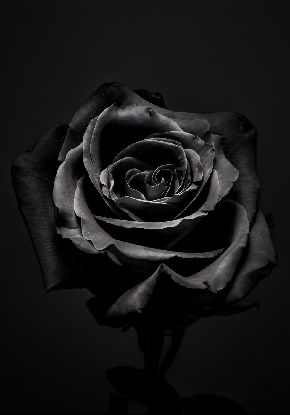 Eine beeindruckende Nahaufnahme einer schwarzen Rose vor dunklem Hintergrund, die Geheimnis, Eleganz und Stärke symbolisiert. Diese dramatische Blumenkunst eignet sich perfekt für moderne, gotische und minimalistische Innenräume.