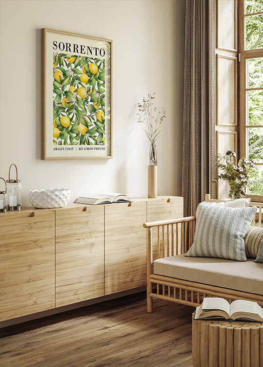 Eine lebendige und frische Illustration üppiger Zitronenzweige aus Sorrent, Italien. Die hellgelben Zitronen, grünen Blätter und zarten weißen Blüten sorgen für eine mediterrane Atmosphäre. Diese botanische Kunst verleiht Wärme und Eleganz und eignet sich perfekt für die Küche, das Esszimmer oder jeden Raum mit einer Vorliebe für die Amalfi-Ästhetik.