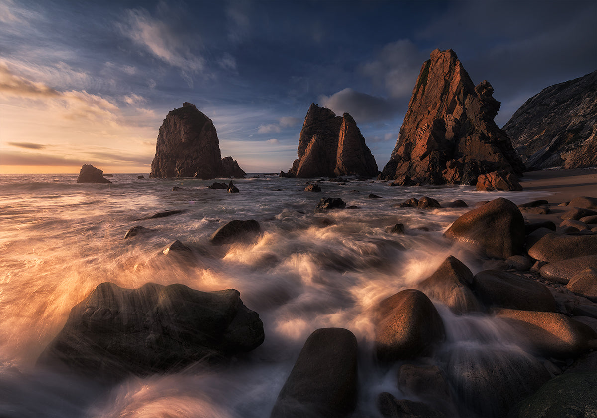 Ursa Beach von Carlos F. Turienzo fängt die raue Poesie des Atlantiks in Sintra ein: dramatische Klippen ragen aus dem Meer, während goldene Dämmerung schäumende Wellen streichelt. Eine stimmungsvolle Meereslandschaft, in der sich Regen, Licht und Gezeiten in einem zeitlosen Moment an der wildesten Küste Portugals treffen. Perfekt zum Träumen bis zum Horizont.