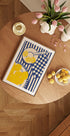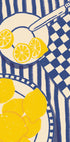 Diese fröhliche Illustration fängt den lebhaften Charme einer mediterranen Sommertafel ein. Geschnittene Zitronen auf einem weißen Teller, eine karierte Serviette und ein Haufen ganzer Zitronen liegen auf einer stark blau gestreiften Tischdecke – und sorgen für eine frische und fröhliche Atmosphäre in der Küche. Der handgezeichnete, stilisierte Stil verleiht einen künstlerischen Touch, während die gelbe und blaue Farbpalette Erinnerungen an das Küstenleben und sonnige Morgen weckt. Perfekt, um Energie und zitrische Eleganz in Ihre Küche, Ihr Esszimmer oder Ihre Galeriewand zu bringen.