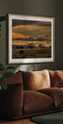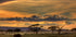 A breathtaking poster of the African savannah at sunset, with golden skies, scattered clouds and acacia trees towering majestically over the misty plains. An elephant grazes in the foreground, capturing the raw beauty of Tanzania's wildlife and nature. Perfect for safari and landscape lovers.