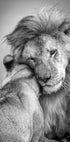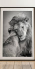 A touching black and white wildlife poster showing a lion and a lioness in a tender embrace. Captured in Tanzania's Serengeti, this artwork symbolizes love, strength and devotion in nature. Perfect for nature, animal and romantic interiors.