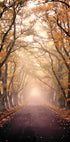 A dreamy autumn alley flanked by tall oak trees, where the golden leaves shine through the soft mist. The misty atmosphere creates a sense of calm and mystery, leading the eye down the endless road. A fantastic seasonal print that captures autumn landscapes.