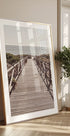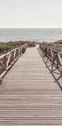 A serene coastal photograph showing a wooden boardwalk leading directly down to the sparkling sea. The vanishing point perspective invites the viewer to walk towards the horizon and evokes feelings of calm, freedom and the stillness of summer.