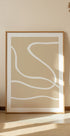 A calming, minimalist poster with flowing white lines on a beige background. The abstract composition radiates simplicity, harmony and elegance, making it a timeless piece for modern interiors.