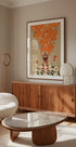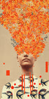 A surreal digital collage combining portrait, birds and a vibrant explosion of orange flowers. The artwork combines vintage botanical and ornithological illustrations with modern surrealism, and symbolizes the harmony between man and nature. The warm autumn tones make it a striking element in both eclectic and modern interiors.