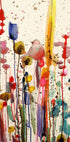 A colorful watercolor work with a whimsical bird surrounded by abstract flower shapes. The colors drip and flow on the canvas, creating a dreamy, painterly effect. The work captures the playful beauty of nature through lively brush strokes and strong tones.