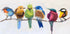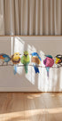 A playful and picturesque artwork of six colorful birds sitting together on a branch. Each bird is uniquely painted with bold strokes of blue, green, yellow, red and brown, creating a lively and expressive composition. Perfect for adding charm and creativity to any wall.