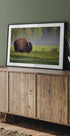 A striking nature photograph of a lone bison standing in a misty meadow at sunrise. Taken in Yellowstone, the image highlights the raw strength and majesty of one of America's most iconic animals, surrounded by the serene beauty of morning light.