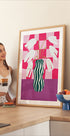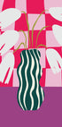 A bold and playful floral still life with a retro-modern touch. The striped vase and abstract white flowers stand against a vibrant pink checkered background, providing a happy mix of colour, humor and graphic design.