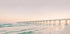 A peaceful coastal view with a long pier stretching out into the sea, bathed in soft pastel colors at sunset. Waves and still skies create a calm atmosphere, perfect for evoking peace and harmony.