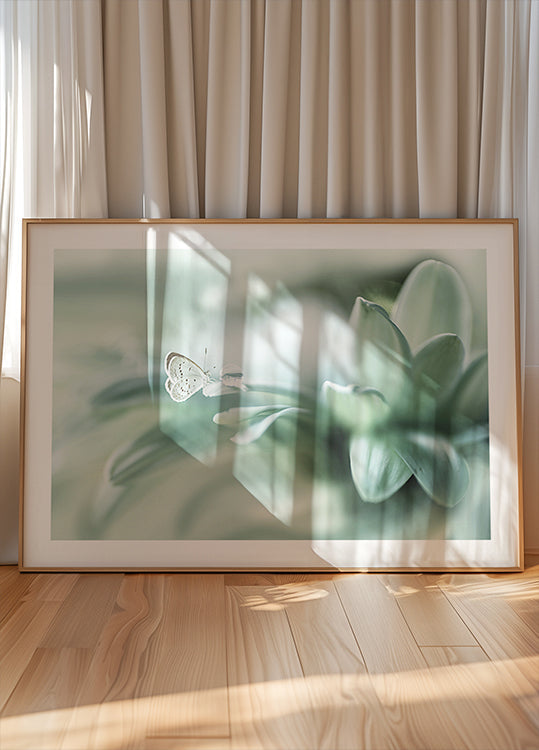 A fine macro photograph of a butterfly gently resting next to a sparkling drop of water on soft green petals. With pastel colors and a dreamy blurred background, this artwork captures fragility, purity and the quiet beauty of nature.