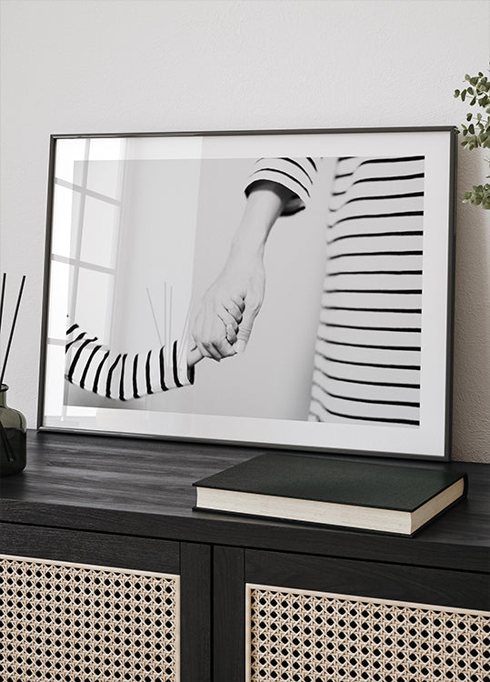 This touching black and white poster captures the beauty of connection and trust. A tender moment between two hands, framed by striped clothes, symbolizes love, family and community. Minimalist yet deeply emotional, a timeless piece that fits perfectly in modern and classic homes.