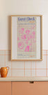 A playful and trendy poster depicting a vintage style restaurant guest card overlaid with pink sketch illustrations of cocktails and toasting glasses. The mix of typography and graphic art creates a bold, modern design perfect for kitchens, bars or for anyone who loves quirky statement prints.