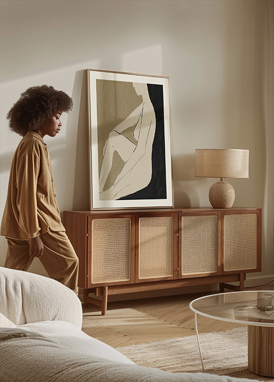 A calm and minimalistic abstract artwork showing a seated female form in muted tones. With painterly brush strokes and modern simplicity, the work expresses calm and relaxation, ideal for modern interiors and artistic wall decoration.