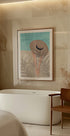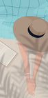 This calm summer illustration captures a relaxed moment by the pool. A woman's arms rest elegantly on the tiles of a sparkling turquoise pool, while her wide-brimmed hat casts a soft shadow over the sunlit scene. An open book next to it suggests a lazy afternoon of reading, dreaming and warmth. An ideal piece to inspire calm, enjoyment and presence — and bring relaxed holiday vibes into your space.