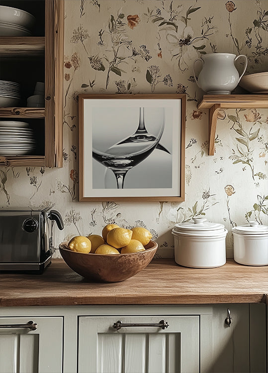 Minimalistic and monochrome poster, where two wine glasses form pure geometry: one standing, the other upside down. The curved silhouettes mirror each other in bright light and soft shadows, while negative space creates calm and balance. An elegant still life, perfect for the kitchen, bar cart or dining room. Subtle and sophisticated, with a quiet drama.