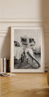 A stylish black and white photograph of a woman in a bathrobe with a towel around her head elegantly reading a newspaper at breakfast. With its refined simplicity and timeless aesthetic, the artwork captures the essence of effortless chic, perfect for fashion-inspired interiors.