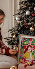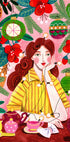 A warm, retro Christmas scene: A smiling red-haired woman in a striped blouse enjoys steaming tea next to a glittering Christmas tree filled with baubles and garlands. Snow glints in the window, colors in pink and pine green create nostalgia. A cosy, midcentury-inspired illustration by Caroline Bonne Müller. Perfect for winter fun.