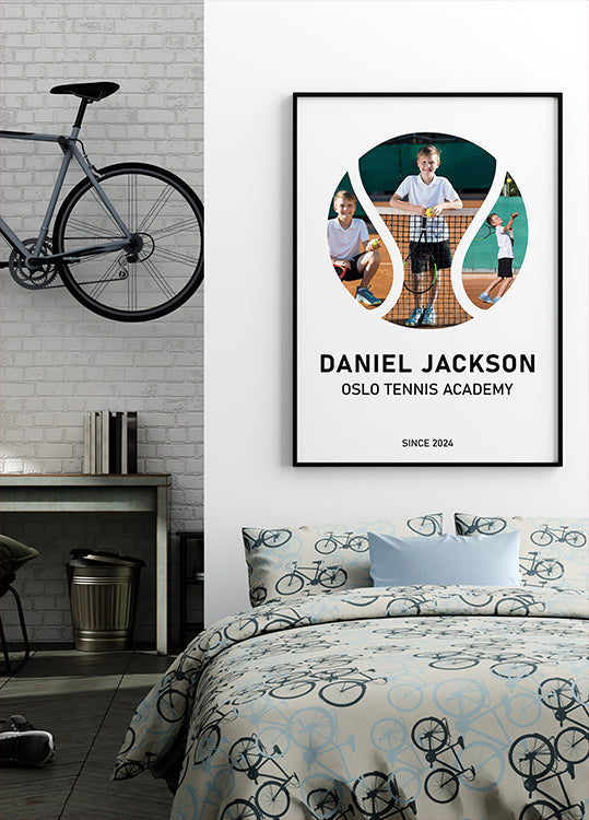 En stilren fotocollage hylder tennisens energi: dynamiske actionbilleder, banens grønne nuancer og karakteristiske hvide linjer samles i et harmonisk layout. Personliggør med dine egne fotos, navn eller dato, så plakaten fanger dine største serves, smashes og øjeblikke ved nettet. Perfekt som gave til spillere, fans og klubkammerater.