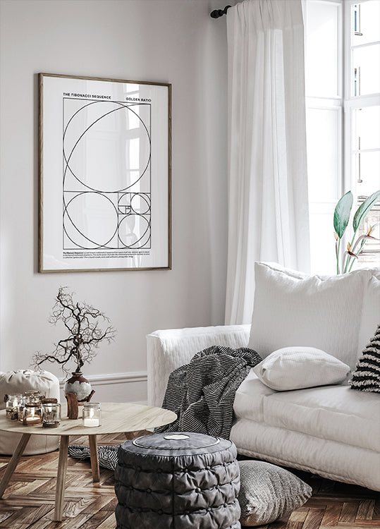 A minimalist math poster illustrating the Fibonacci sequence and the golden ratio. This elegant design showcases the geometric relationship found in nature, art, and architecture. Perfect for math lovers, students, and modern decor.