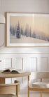 A poetic winter landscape scene unfolds: snow-covered pine trees stand tall while fine snowflakes fall silently through the blue-gray dusk. Lines and layers create depth that leads the eye into the forest and evokes a calm, Nordic melancholy – quiet, fresh and enchanting. Perfect for creating wintry tranquility in the living room.