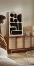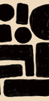 Kaasaegne abstraktne kunstiteos, mille silmatorkavad mustad kujundid on hajutatud soojal beežil taustal. Tekstuuriga pintslitõmbed ja orgaanilised kujundid loovad tasakaalu ja lihtsuse tunde – ideaalne Skandinaavia, Jaapani või kaasaegse interjööri jaoks.