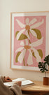 Sellel kaasaegsel abstraktsel lillelisel kunstiteosel on elegantsed valged lilled pehmete kroonlehtede ja maalähedaste roheliste lehtedega soojal pastelselroosal taustal. Minimalistlik, kuid ilmekas teos ühendab botaanilise ilu kaasaegse illustratsiooniga, lisades värskust ja võlu igasse interjööri.