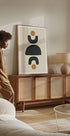 Sellel kaasaegsel abstraktsel plakatil on julged mustad geomeetrilised kujundid ja kaks põletatud oranži ringi, mis on paigutatud vertikaalselt tasakaalustatud kompositsiooni. Disain kiirgab harmooniat, struktuuri ja lihtsust – ideaalne modernsesse ja minimalistlikku interjööri. Tekstuuriga taust ja pehmed konarused lisavad soojust ja iseloomu. Ideaalne rahuliku ja kunstilise atmosfääri loomiseks elutuppa, kontorisse või galerii seinale.