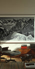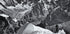 Vapustav mustvalge foto mägironijast, kes seisab kitsal lumeharjal Prantsuse Alpides. Dramaatiline vaade jäädvustab sakilised tipud, sügavad orud ja silmapiirini ulatuvad liustikud. Tugev austusavaldus seiklusele, vastupidavusele ja alpimaastike ilule.