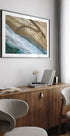 Hingemattev droonipilt California rannikust Big Suris. Kokkupõrked lained kohtuvad liivase rannikuga ahvatlevas, abstraktses looduse tekstuuride kompositsioonis. Ideaalne ranniku ilu ja vaikuse toomiseks oma koju.