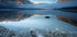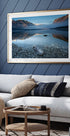Rahulik maastikuplakat Bohinj järvest Sloveenias, kus vaiksed veed peegeldavad mägesid ja udu. Selge rannajoon kivide ja puutüvega suurendab rahulikku ja harmoonilist atmosfääri, mis on ideaalne rahu ja vaikuse loomiseks igas ruumis.