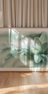 Peen makrofoto liblikast, kes puhkab õrnalt sädeleva veetilga kõrval pehmetel rohelistel kroonlehtedel. Pastelsete värvide ja unenäoliselt hägusa taustaga kunstiteos jäädvustab haprust, puhtust ja looduse vaikset ilu.