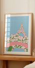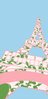 Moodne ja elav illustratsioon Eiffeli tornist Pariisis, mis on kaunistatud mänguliste roheliste lillemustritega pehmetel roosadel joontel selge sinise taeva taustal. See kunstiteos annab värske, naiseliku ja stiilse pöörde maailma ühele ikoonilisemale vaatamisväärsusele, mis sobib ideaalselt naiselikku interjööri, reisimisest inspireeritud ruumidesse või seinale.