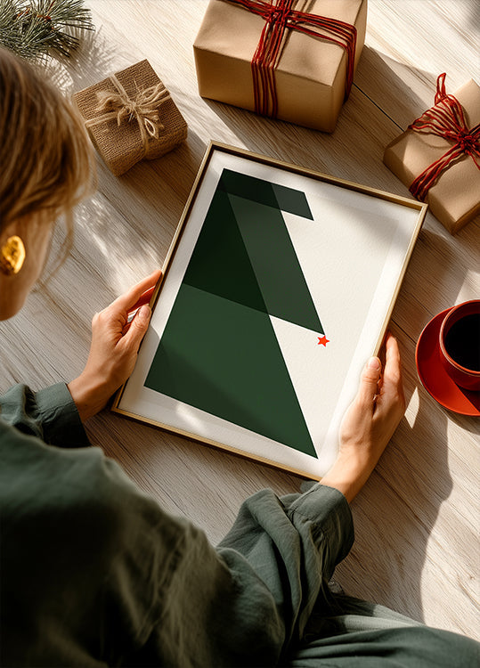 Skab stille julestemning med Holy Night, Silent Night 2 af Kubistika: et minimalistisk, grafisk motiv hvor geometriske grantræer rejser sig mod en dybgrøn nattehimmel, strøet med funklende stjerner. En rolig og moderne hyldest til vinterens magi, der løfter både stue og galleri. Perfekt som elegant vinterpynt og gaveidé.