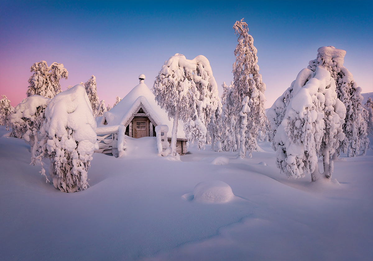 Home Sweet Home af Raymond Hoffmann fanger roen i et finsk vinterlandskab: en ensom træhytte omfavnet af sne, rimklædte træer og klar, kølig luft. Den stille stemning og de dæmpede toner giver følelsen af varme midt i kulden – et tidløst motiv, der bringer naturens poesi ind i hjemmet. Perfekt som et roligt fokuspunkt i stuen.