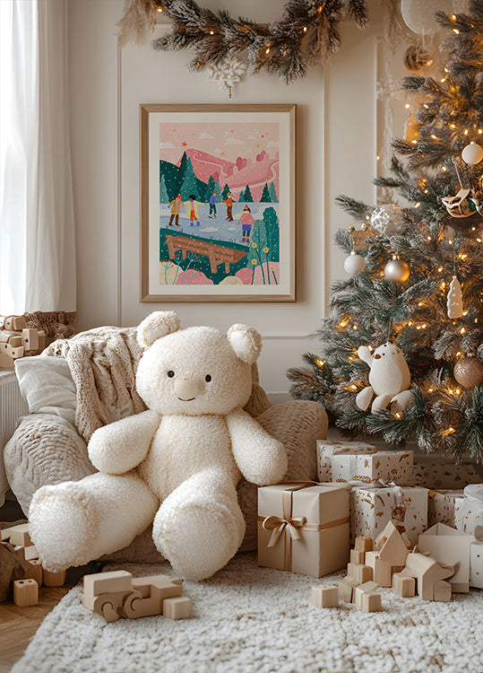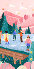 Bea Mülleri mänguline talvemotiiv: jäätunud järvel uisutavad lapsed ja täiskasvanud ümber ehitud kuuse, samal ajal kui lumehelbed õhus tantsivad. Taustal on pehmed mäed ja tume kuusk, mis raamivad pidulikku meeleolu. Värvid on soojad ja särtsakad, täis talvemaagiat. Austusavaldus perekonnale, kogukonnale ja hooaja rõõmule.