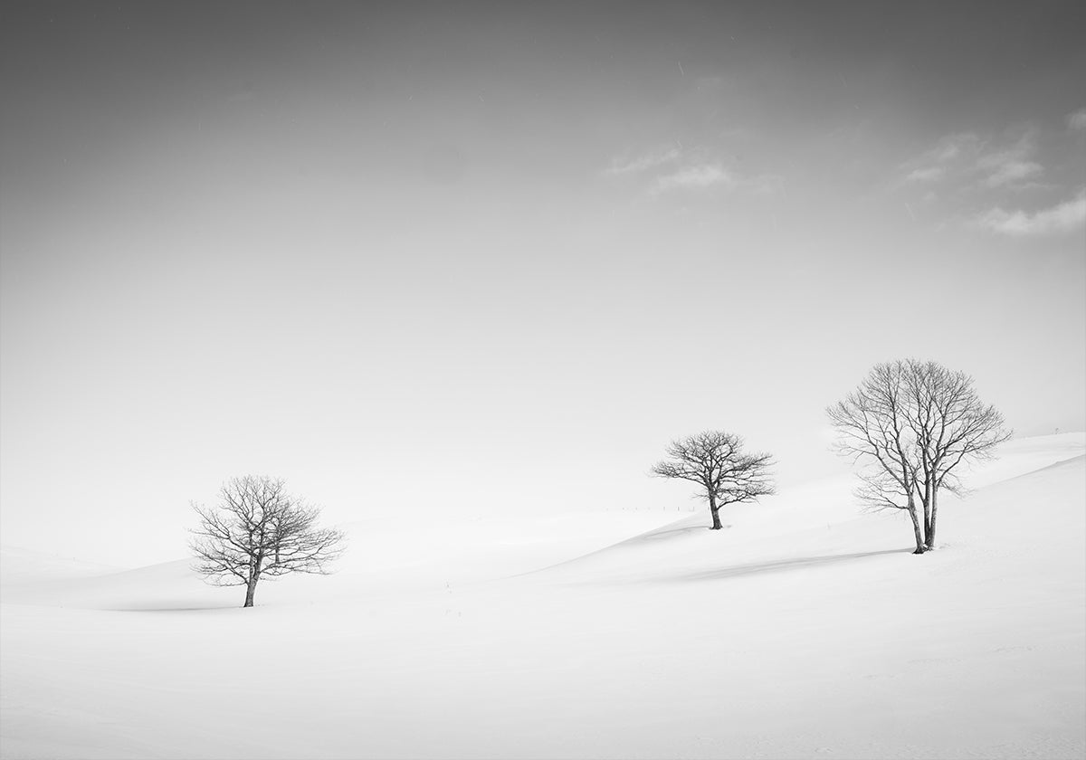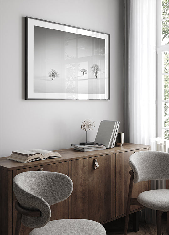 Just the Three of Us af Robert Bolton indfanger vinterens stille poesi: tre træer står side om side i et højlyst, sneklædt landskab, hvor frost og tåge udvisker horisonten. En minimalistisk komposition fyldt med luft, lys og ro, der skaber plads til eftertanke og harmonisk stilhed. Perfekt til at bringe en følelse af nordisk ro ind i hjemmet.